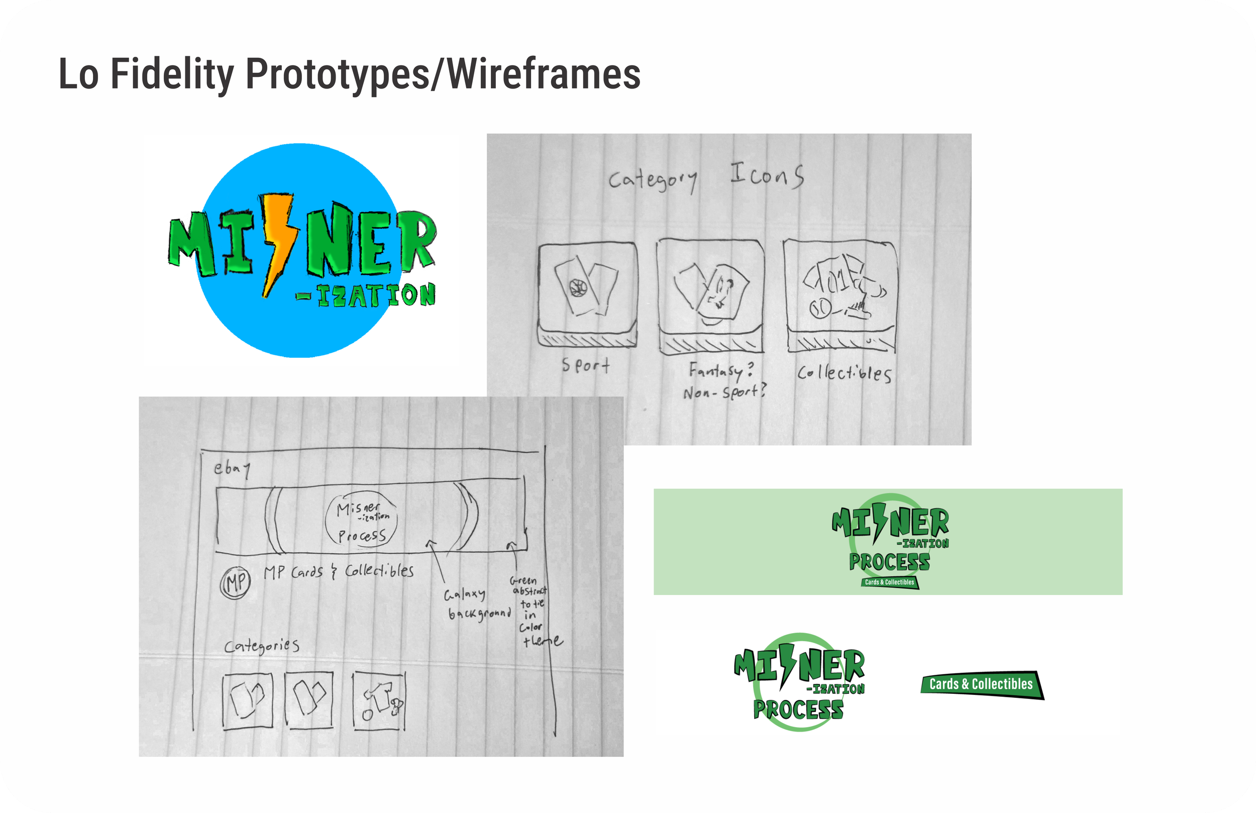 After conducting preliminary research to better understand the client’s vision, industry norms, and user’s needs, I narrowed my focus to a few specific products that would have maximal impact on MP Cards & Collectibles’ visual identity and marketing reach. I also researched copyright licensing and laws extensively to ensure that the products would not cause issues down the road. From there, I began drawing. In the early stages of the design process, I sketched wireframes on paper, and then created Lo Fidelity digital renderings so I could experiment with different color and layout options.