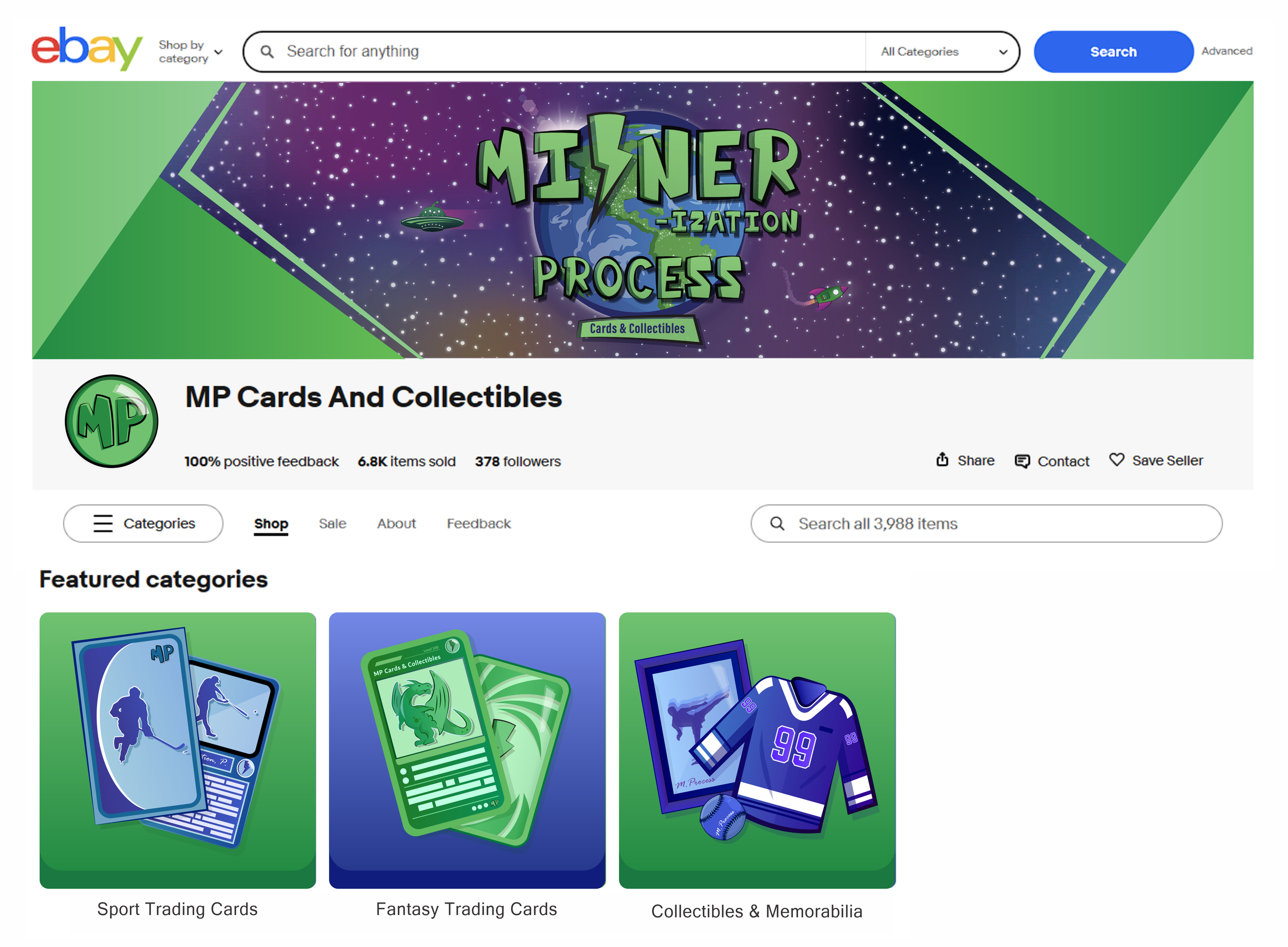 When I first began this project, the MP Cards & Collectibles eBay store page needed a good touch up. They did not previously have access to a graphic designer, and were using stock photos and copyrighted fantasy art on the main page.