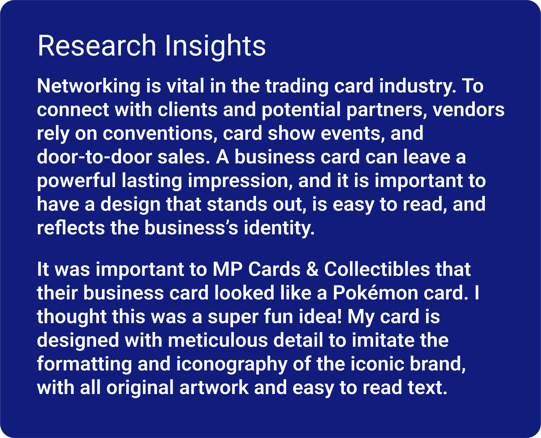 MP Cards & Collectibles is a family owned collectibles trading startup I did freelance design work for in Northern BC. Initially started as a hobby, they quickly made partnerships with other vendors across the region and were able to garner a large client base through online trading. The business is exclusively platformed on eBay, with advertising mostly being done either online or through networking, advertising at trade shows, and word of mouth.