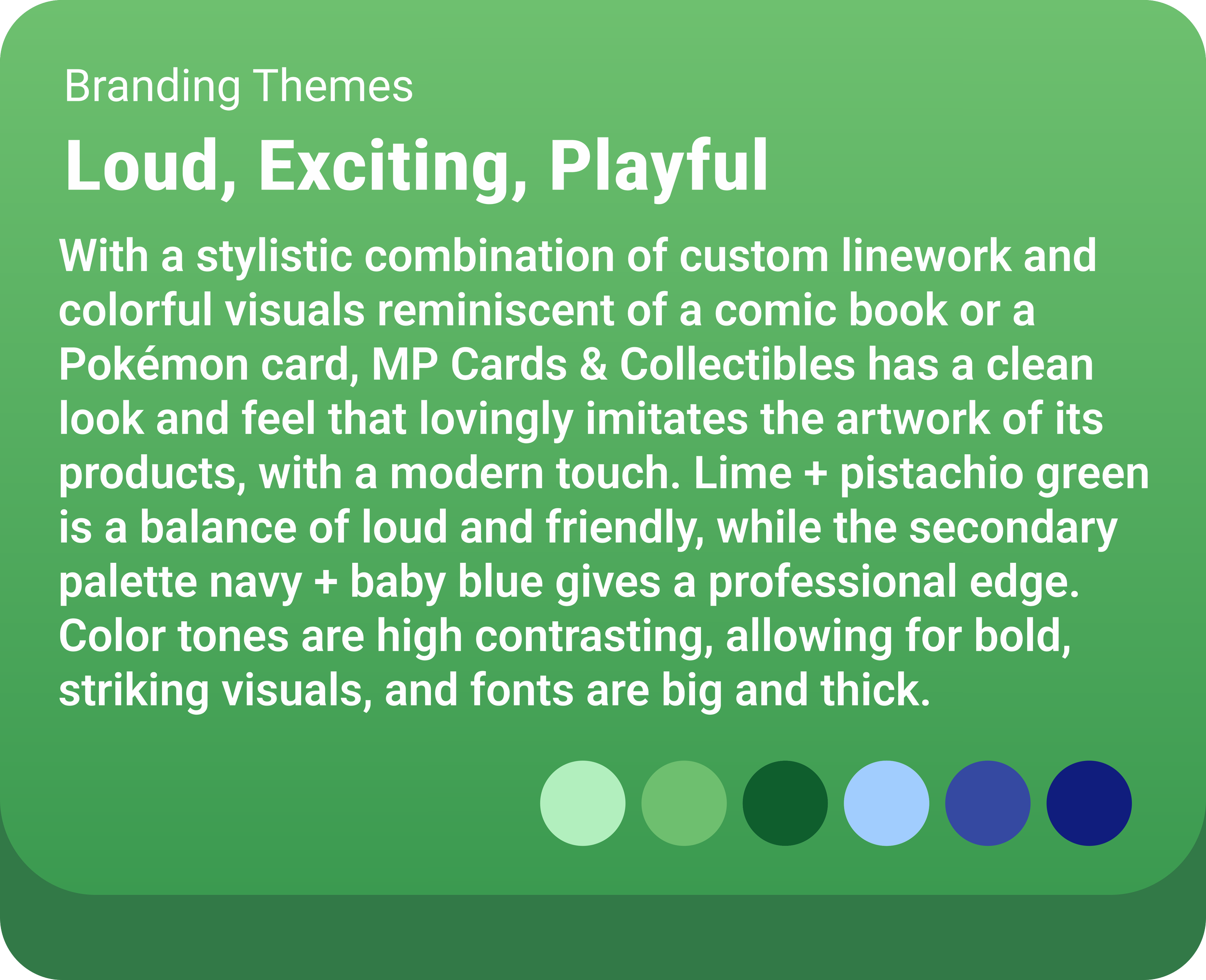 MP Cards & Collectibles envisioned branding that reflected the playful drawing styles of the items (i.e., Pokémon, sports cards) they were trading, with many detailed artistic variations of the official logo for various media applications. The branding I designed for them is a carefully stylized blend of comic themed and modern abstract visuals. Assets are bubbly, colorful, high contrasting, and integrate various art styles reminiscent of trading cards, while maintaining a minimalist look and feel. Consistency is critical when developing a brand that is easily recognizable, and a large part of the development process involved narrowing ideas down to a unified style.
